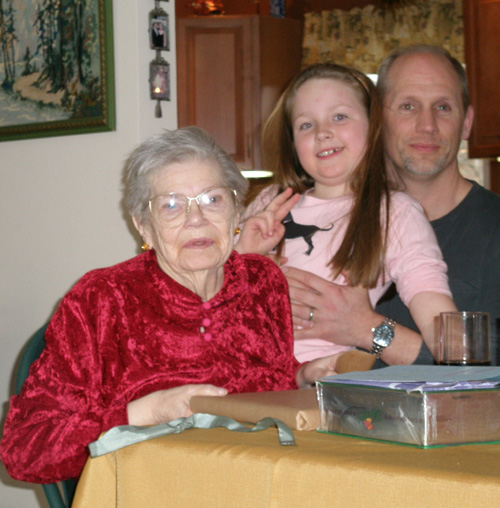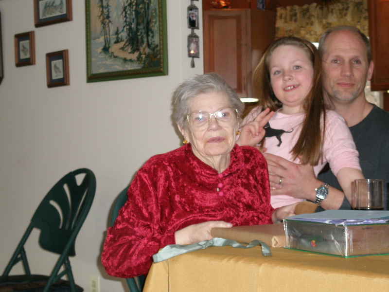 Gloria Yelavich on her 85th Birthday (April 12, 2008) with Great Granddaughter Chloe Blauner and Grandson Michael Blauner Added: 9/7/2008 source photo